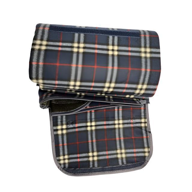This blanket is a polyester fleece plaid with lining and water resistant PVC backing. It easily folds within itself. The Independence circle logo is featured along with Velcro closure and attached handle for easy carrying.